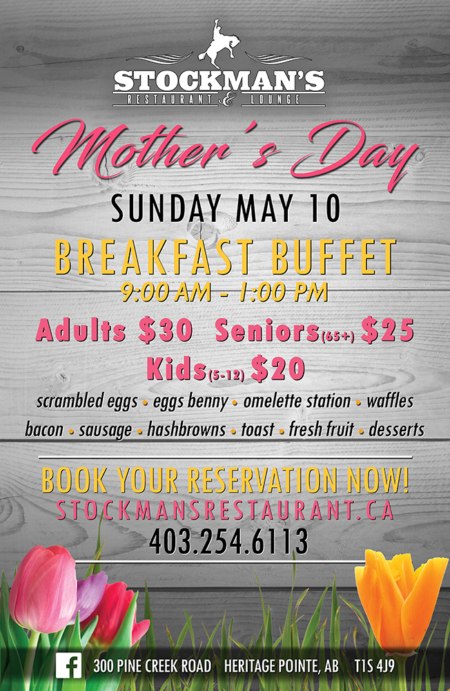 Mother’s Day Breakfast Buffet 9:00 AM – 1:00 PM Scrambled eggs, eggs benny, omelette station, waffles, bacon, sausage, hashbrowns, toast, fresh fruit, desserts. Adults $30 Seniors (65+) $25 Kids (5-12) $20 BOOK YOUR RESERVATION NOW! Share: